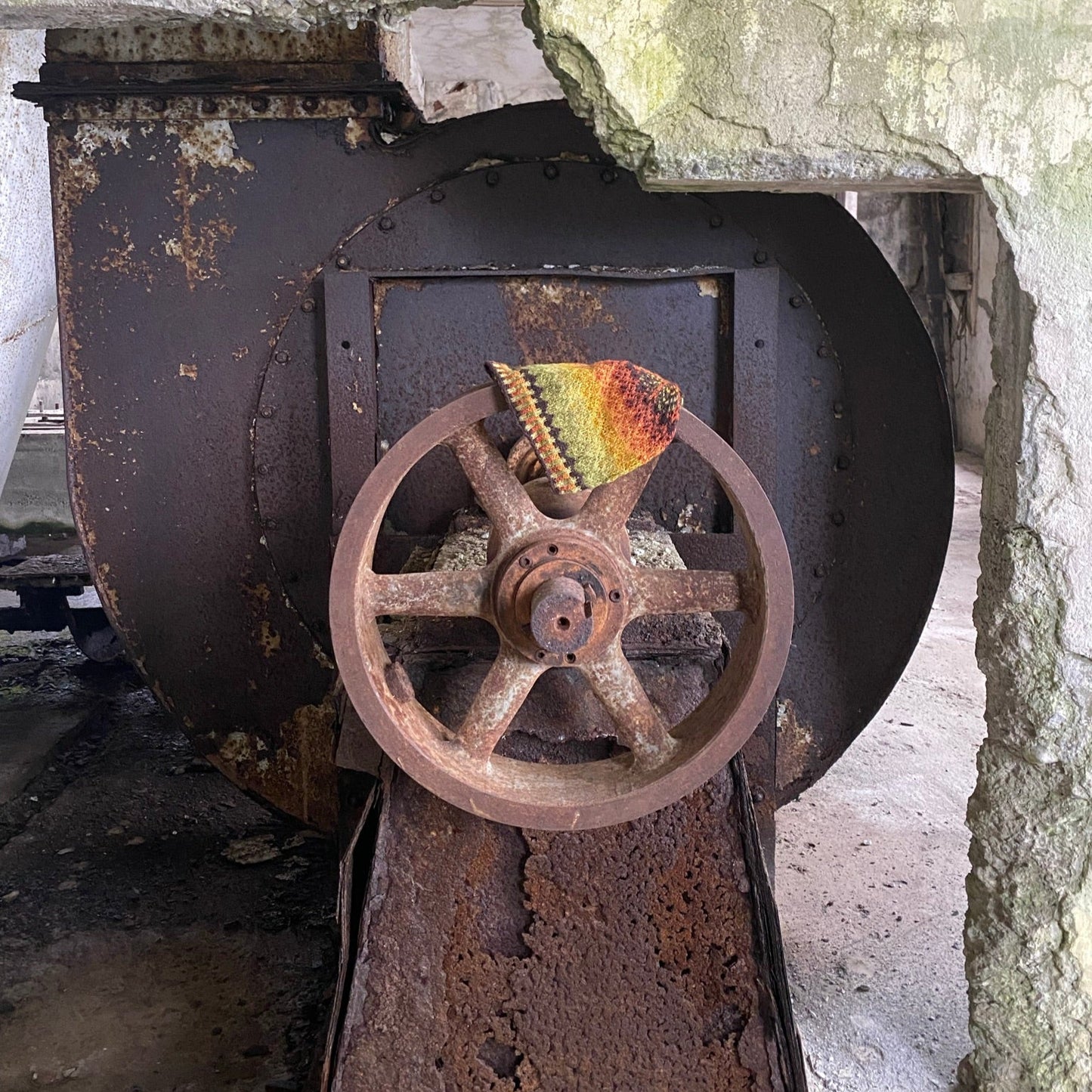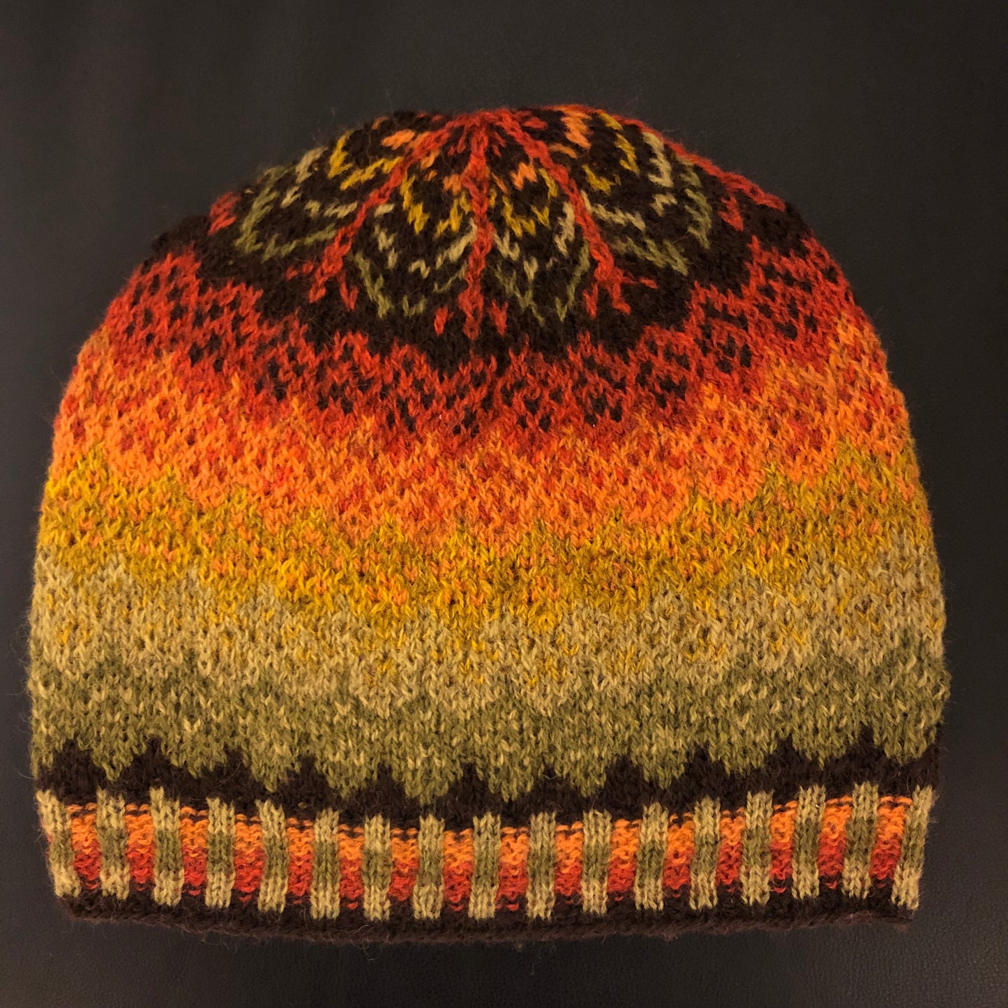 Hefðbundið tvíbanda húfu prjón með marglitu tvöföldu stroffi. Mynstrið er reglulegt. Löng bönd myndast einungis á fáum stöðum, sem hægt er að festa í þriðju hverri lykkju á bak við. Í úrtökunni á húfunni er í nokkrum umferður 3 og jafnvel 4 litir en þraukaðu þú ert að verða búin.