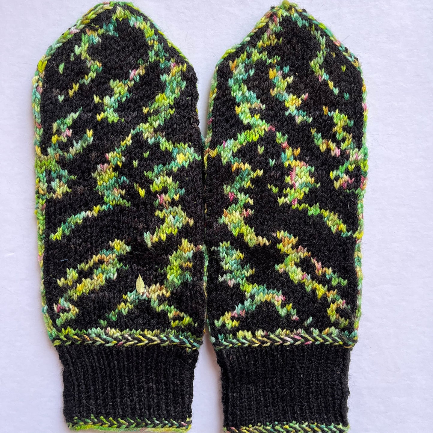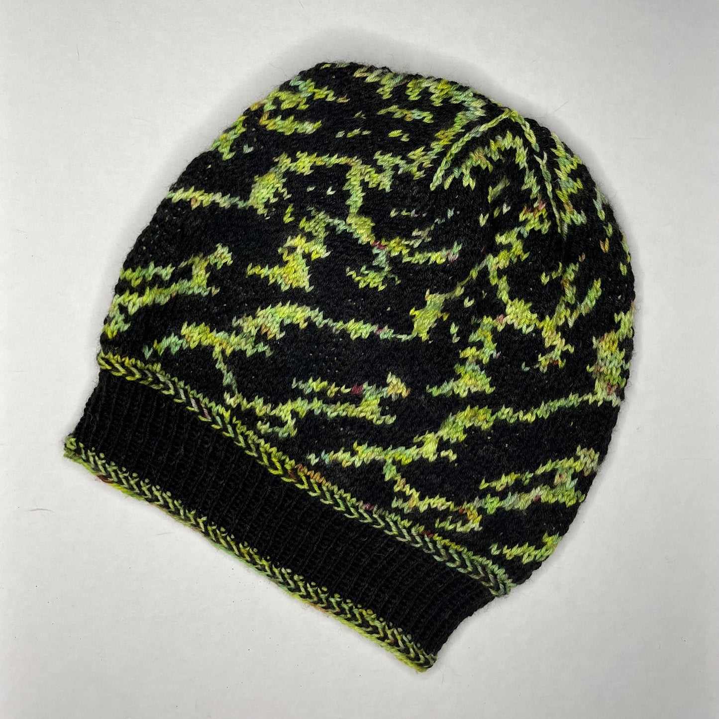 Tvíbanda húfuprjón með tveimur lettneskum fléttum. Mynstrið er óreglulegt og breytist í hverri umferð, númerið í síðasta reitnum í hverri línu segir til um fjölda lykkja í sama lit. Löng bönd myndast einungis á fáum stöðum, sem hægt er að festa í þriðju hverri lykkju á bak við. Hafið mynsturlitinn nær ykkur.